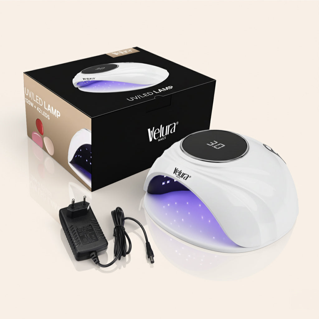 De Velura® Nagellamp Performance biedt 120W vermogen en 42 leds voor snelle, egale uitharding van BIAB, gel en polygel. Met automatische sensor, LCD-display en een modern design voor salonkwaliteit bij elke behandeling.